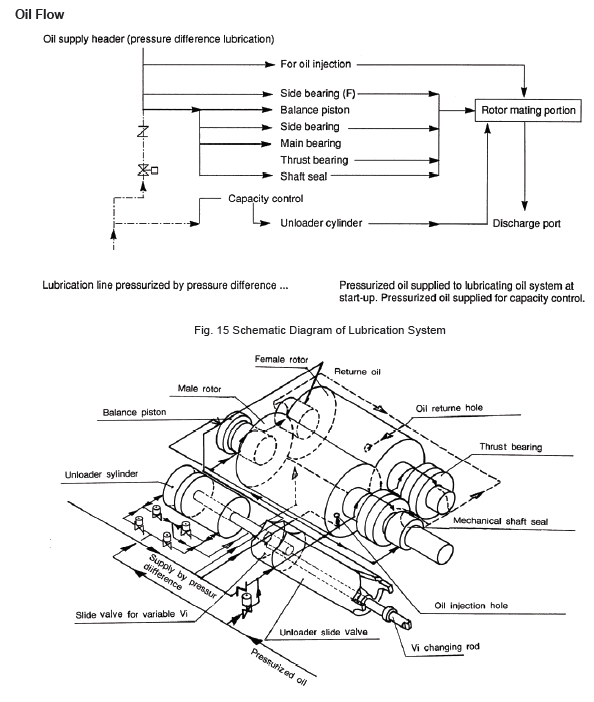 d) Compressor oil flow Oil for lubrication and for injection is supplied from a high pressure side oil tank by the pressure difference with the low pressure side or by an additional pump. Regarding oil injection, conventional compressors have oil injected into the triangular blow hole in the mating portion of the unloader slide valve but V-Series compressors utilize a system whereby oil is supplied from a fixed position on the M rotor side rotor casing.