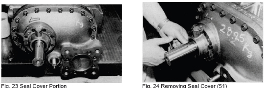 g) Fit the O-ring (103) for the carbon and the carbon insert (101) in the seal cover (50). Fit the gasket (52) on the seal cover (50) and position it correctly to match the oil holes in the bearing cover and then fit the seal cover by sliding it onto the shaft. When fastening the seal cover, the carbon should first contact the seal ring (104).