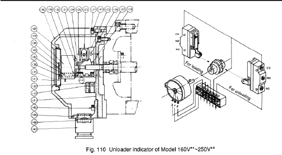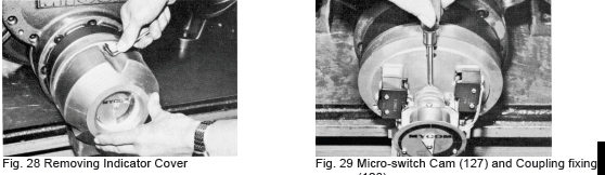 d) Fit the dial plate and mount the indicator pointer (139), aligning it to the no-load position. If a full load micro-switch is provided, adjust the micro-switch setting screw (126) so that it is actuated by the cam. Actuation of the micro-switch (125) is confirmed by moving the unloader slide valve (54) to the