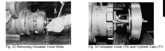 e) After confirming proper actuation, connect the control wiring as before and mount the unloader indicator cover (146). Be careful not to pinch the wires with the cover. Disassembly, inspection and reassembly of the V-Series compressor unit are now completed.