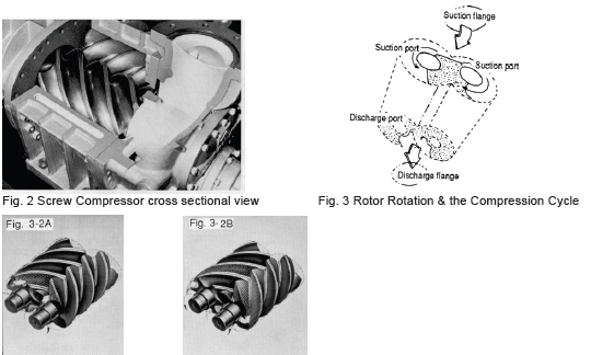 As shown in Figs. 1 and 2, a pair of mated helical gears, or rotors, are mounted in the compressor casing. The rotor having the four-lobe section is called the male (M) rotor while the one with the sixlobe section is called the female (F) rotor. A two-pole motor connected directly to the M rotor drives the compressor at speeds of 2,950 rpm or 3,550 rpm (50 Hz or 60 Hz) Compressor efficiency is directly related to the shape of the rotor lobes. In the case of the V-Series, the rotors have unsymmetrical profiles in contrast to conventional screw compressor rotor lobes. This unsymmetrical design reduces the triangular blow off hole between the casing and the rotors to 60%, minimizing leakage due to the pressure difference. Normally, an oil film seals the clearance between the leading edges of the rotor lobes and the casing. With the V-Series, however, a change has been incorporated to raise the pressure of the oil film and the clearance between the casing and the lobe leading edges is wedge shaped.