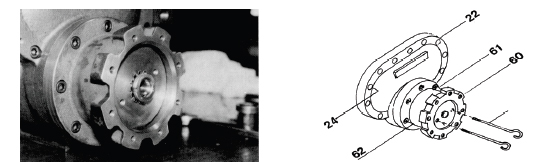 c) Fit the gasket (23) and push the unloader cylinder (60) into the suction cover (5). Fit the blind cover (22) temporarily using two or three bolts. Fix the unloader piston (64) to the unloader push rod (67) using the lock washer (70) and lock nut (69). Be sure to bend the claw of the lock washer.
