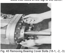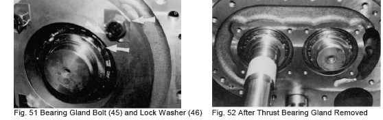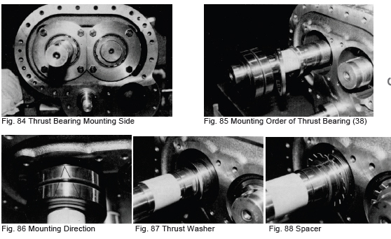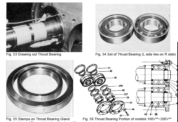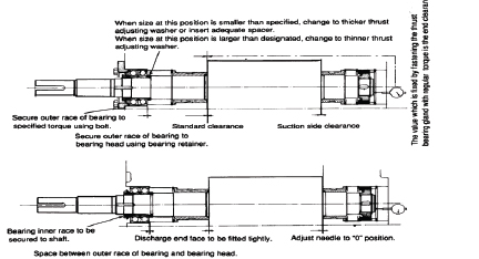 f) If the thrust bearing is being replaced with a new one, confirm that the end clearance of the bearing is secured while loosening the bolt little by little. Since the difference in the side faces of the inner and outer bearing races vary even if the bearing is within specifications, no clearance is secured in some cases. If the nuts are tightly fastened from the beginning, in this case the bearing balls will be pressed against the rolling contact surface and damaged. If no clearance is secured, grind the thrust bearing gland (41) or replace the thrust adjusting washer (42) with one or greater thickness. If only a slight clearance is required, a thing plate may be affixed to the thrust adjusting washer.
