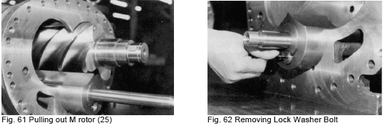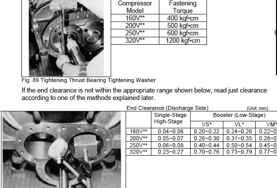 In this case, the rotor will not rotate when the lock nuts are tightened. The reason is that the thrust adjusting washer (42) is not thick enough or the bearing gland (41) is too thick. Accordingly, a shim of the required thickness must be inserted between the thrust adjusting washer and the inner race of the thrust bearing. Using a new thrust adjusting washer with the correct thickness is much better than adjusting the thickness with shims. If the gland is too thick, it should be ground to the necessary dimensions (since no gland is proved on the 250V** and larger compressor models, adjustment must be accomplished with the adjusting washer (42)). After adjusting the clearance, measure several times and confirm that the proper end clearance is achieved.