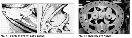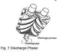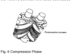 As the rotors further rotate, the suction side of the clearance is sealed by the mating of the lobes and the volume between the lobes decreases while the sealing line moves toward the discharge side.