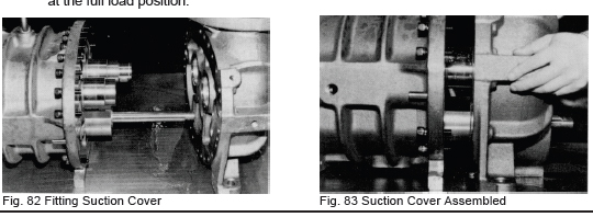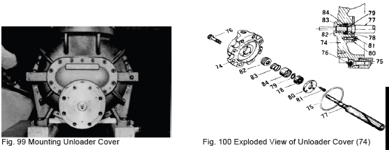 e) Position the unloader slide valve (54) in the no-load position (piston at the innermost point) and push in the cover while mating the groove on the cylinder cam with the pin on the push rod (67). Fasten the screws (76) with the outlet of the unloader piston hydraulic piping facing up (ref. Fig.100).