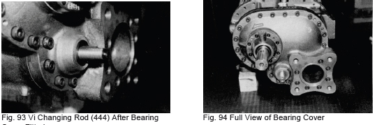 b) Screw a long stud bolt into the bearing head and fit the gasket and the bearing cover, taking care not to damage the shaft seal portion. First mount the Vi changing rod (444), then align the parallel pin (3) and push the bearing cover onto the bearing head, being careful to maintain even alignment. Screw two bolts in at diagonal positions to assure the bearing cover is parallel. Secure the remaining bolts after the full face of the bearing cover contacts the bearing head.