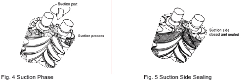 As shown in Fig. 4, the rotors of different lobe shape mate and the clearance between the M and F rotors and the casing expands gradually from the suction side as the rotors rotate. When the clearance reaches maximum as the rotors rotate further, it is sealed by the walls at both ends of the rotor and becomes independent.