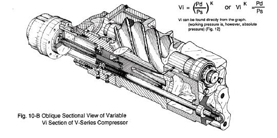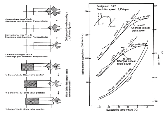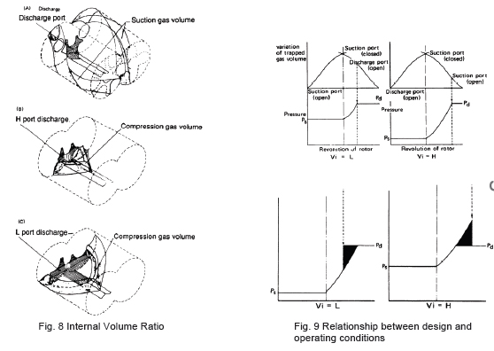 Vi = Volume of suction refrigerant when compression begins Volume of same quantity of refrigerant at discharge port In other words, Vi is the ratio of the groove volume after competition of suction to the volume when the discharge port opens. Conventional screw compressors have three fixed Vi values, that is 2.63, 3.65 and 5.80, termed “L port,” “M port” and “H port,” respectively.