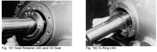 f) Mount the shaft seal assembly (100). Push the O-ring (49) in carefully so that it is not damaged. Two screws are provided for the seal collar (109). Secure the screws (111) making sure that they mate with the countersunk holes in the shaft. After mounting, push on the seal ring (104) manually to confirm axial