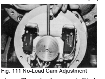 f) The micro-switch (125) is secured with two long machine screws (126). Loosen these screws to remove the micro-switch. The micro-switch component on the right side is for the no-load position signal and the one on the left side is for the full-load position signal. The micro-switch set plate (123), secured by other screws (124), is mounted under the left side micro-switch component. The micro-switch component on the right side is for the no-load position signal while the one on the left side is for the full-load position signal. The micro-switch set plate (123), secured by other screws (124) is mounted under the left side micro-switch component. Adjustment of the micro-switch is accomplished using with microswitch cam (127).
