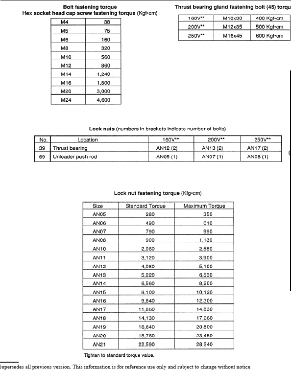 i) Fasten the thrust bearing-tightening washer (43) with the hex-head socket cap screw (45) and hex-head bolt lock washer (46) and torque to the value given in the table below.