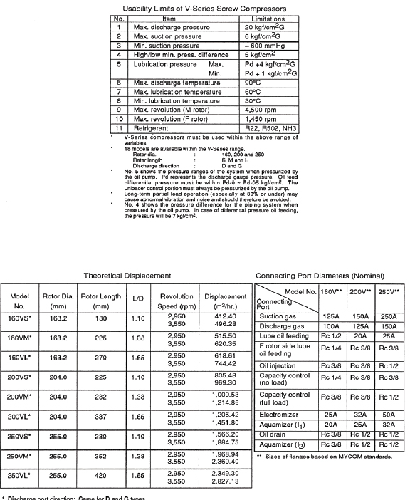 The MYCOM V-Series Screw Compressor (referred to hereafter as the “V Series”) incorporates numerous improvements. A variable Vi mechanism allows these compressors to be adjusted readily for most operating conditions and a new tooth profile (0 profile) has been introduced to further improve performance. The basic construction of the V Series is the same as standard MYCOM compressors except for the addition of the variable Vi mechanism. The operator should have a thorough knowledge of the compressor and the system it is incorporated into before attempting to disassemble the unit for inspection. Read this instruction manual carefully before undertaking any work on the system. This screw compressor is classified as a positive displacement rotary type. It compresses the refrigerant gas continuously using the volume change between two rotating screw profile rotors. Refrigerant gas is trapped in the clearance between the two mated rotors and pressure increased by decreasing the volume. The refrigerant is then discharged as a high-pressure gas.