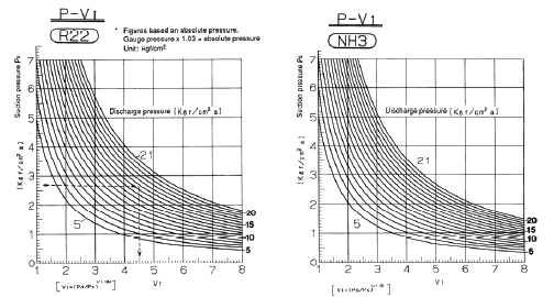 Consequently, the Vi corresponding to the compression ratio changes according to the refrigerant used. For approximate values, refer to the graph given in Fig. 12. The new V-Series, Maximizer Series Screw Compressors, are designed so that the Vi can be adjusted on site according to operating conditions.